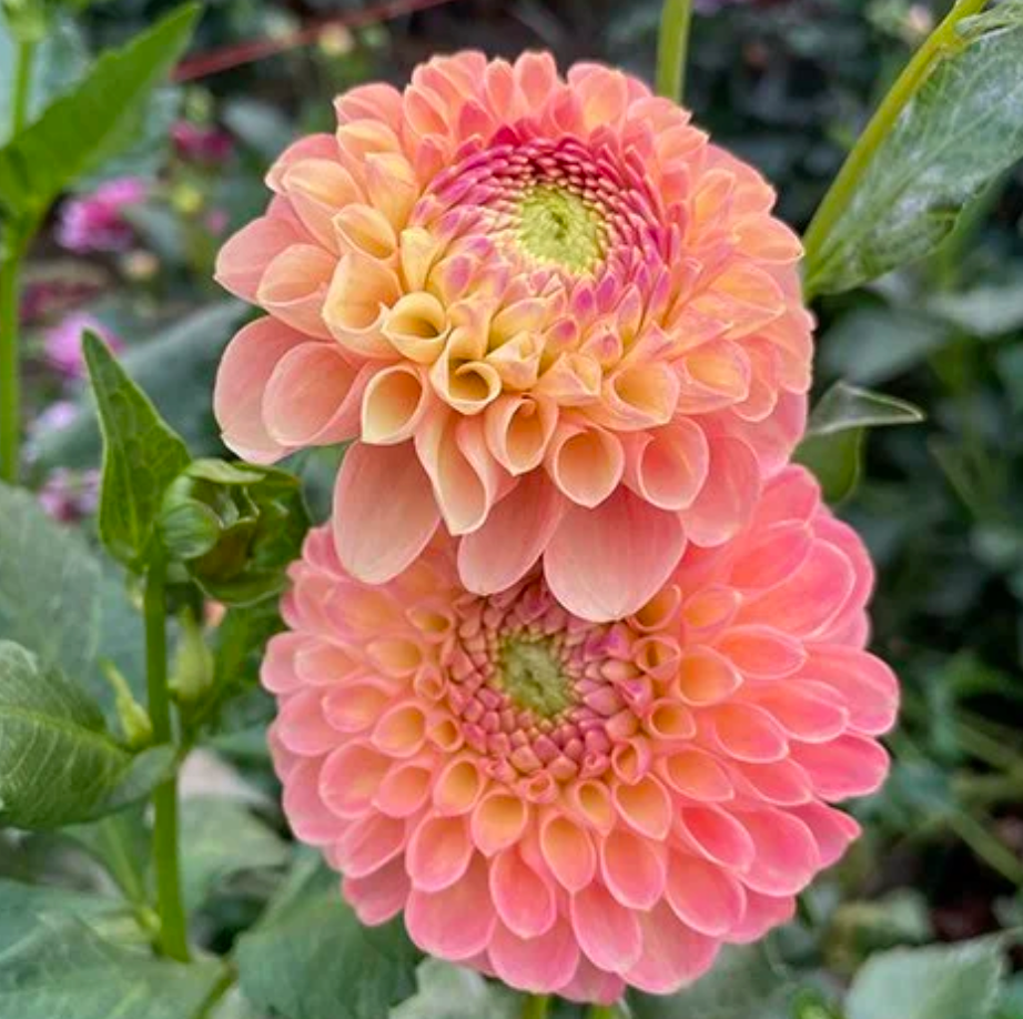 A beautifully variable ball dahlia that blends coral, peach, and apricot tones with hints of soft pink as the season progresses, giving each bloom a subtly shifting palette. It’s vigorous with long, sturdy stems and reliable flower production, making it excellent for both garden colour and cutting for bouquets. Bloom ~4–5″ with classic round form, on plants around 4–5 ft tall.